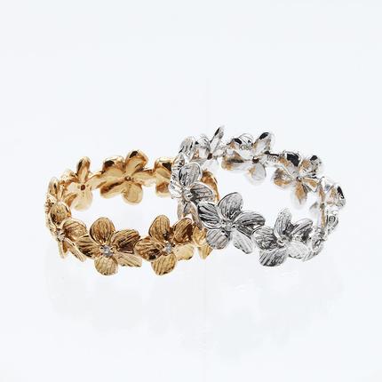エレガントで可愛らしいフルエタニティタイプのハワイアンジュエリー。プルメリアの真ん中にダイヤモンドが留めてあり一枚一枚の花びらを丁寧に形作った匠の一品です。